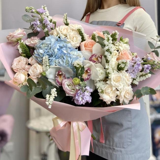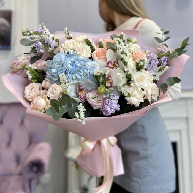 Описание В составе сборного букета: гортензия, орхидея, кустовая роза, статица, матиолла.