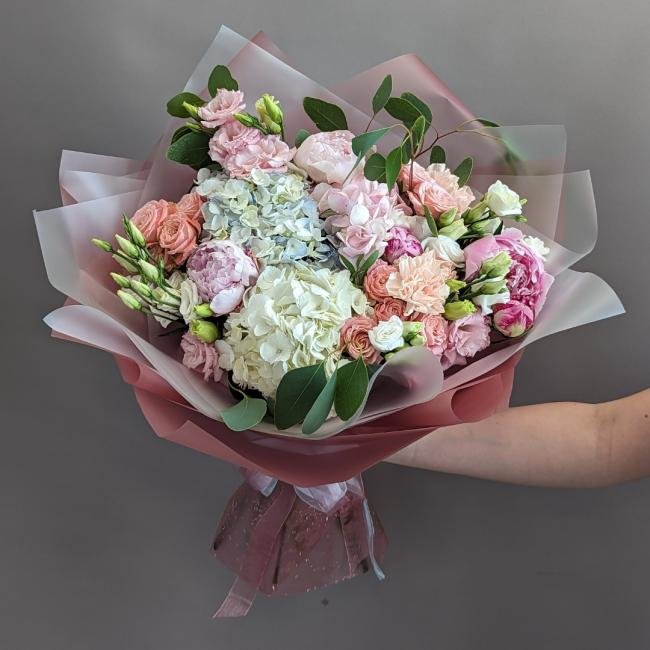 Описание В составе сборного букета: гортензия, пионы, кустовая роза, диантус, эустома, эвкалипт.