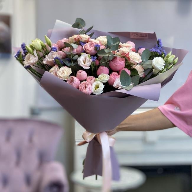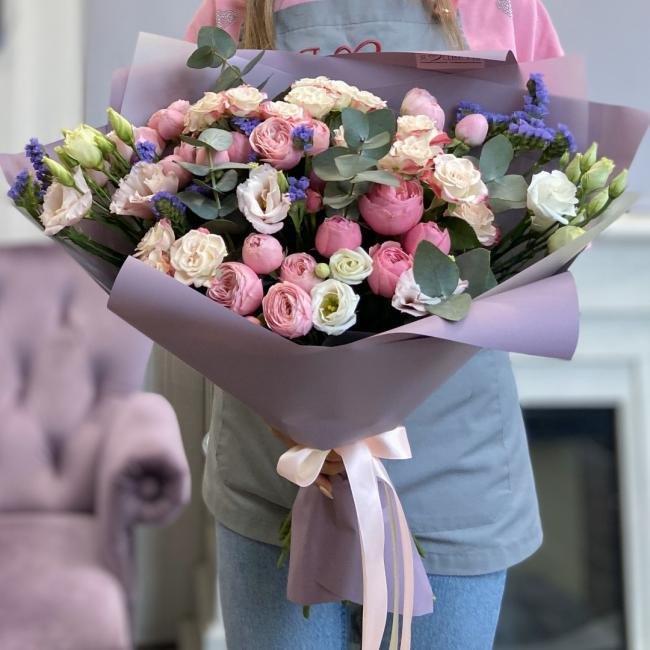 Описание В составе сборного букета: пионовидная роза, эустома, статица, эвкалипт.