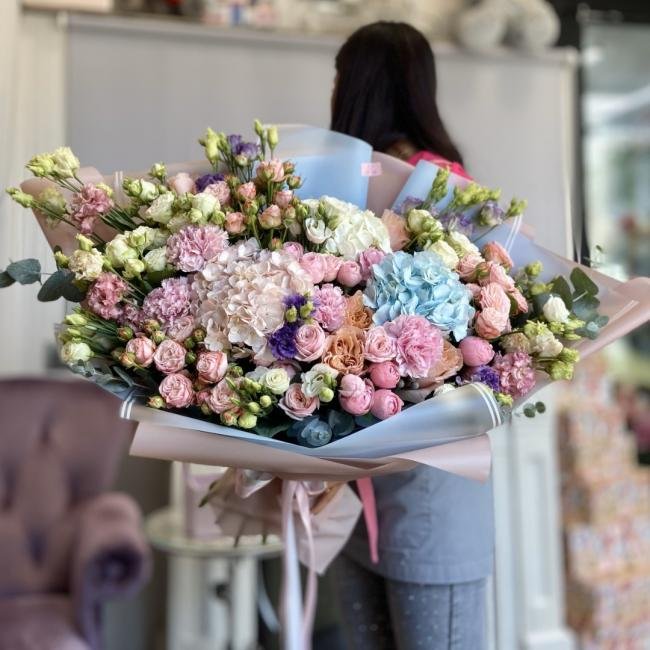 Описание В составе: гортензия, одноголовая и кустовая роза, эустома, диантус, эвкалипт