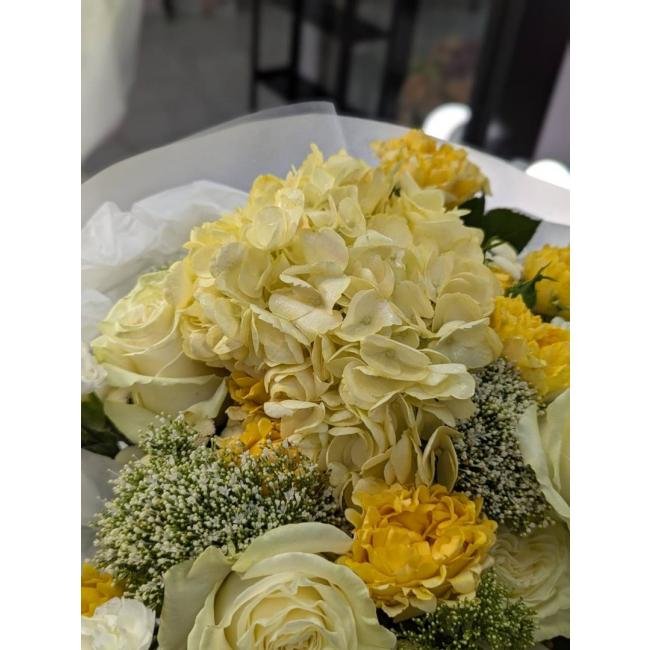 Описание В составе: гортензия, кустовая роза, одноголовая роза, кустовая хризантема, сантини, зелень