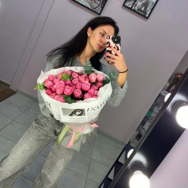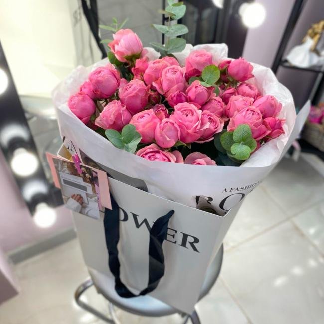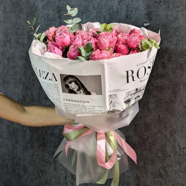 Описание В составе: пионовидная кустовая роза, эвкалипт