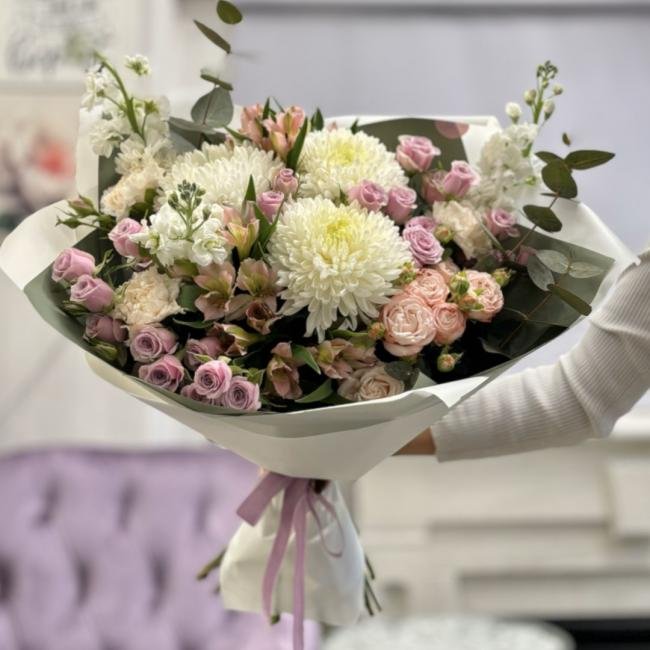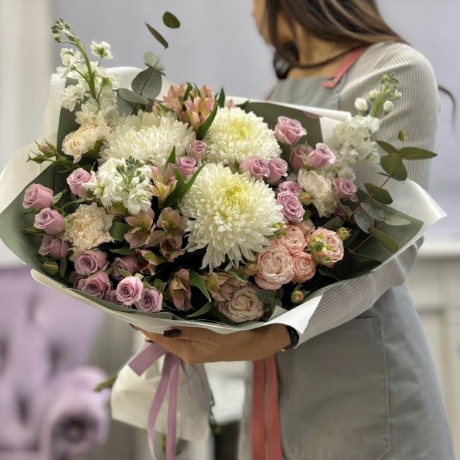 Описание В составе: одноголовая хризантема, кустовая роза, матиолла, альстрамерия,