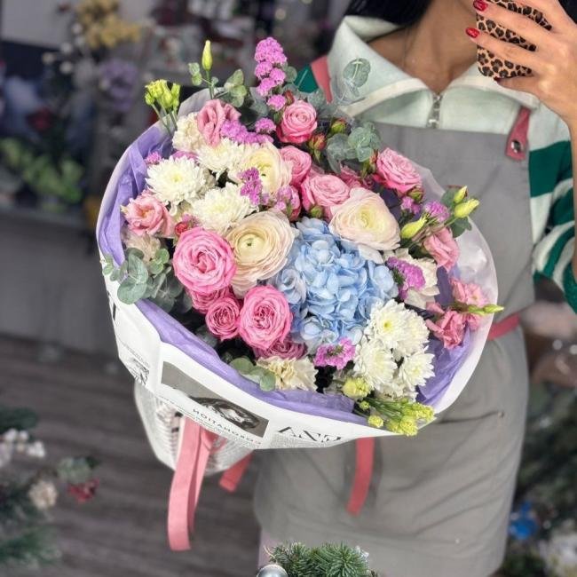 Описание В составе: гортензия, ранункулюс, кустовая роза, кустовая хризантема, эустома, статица