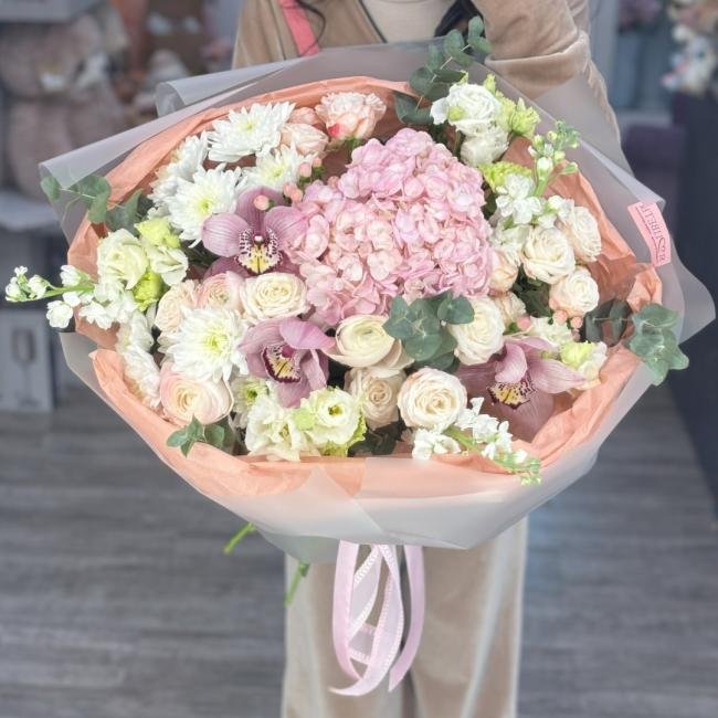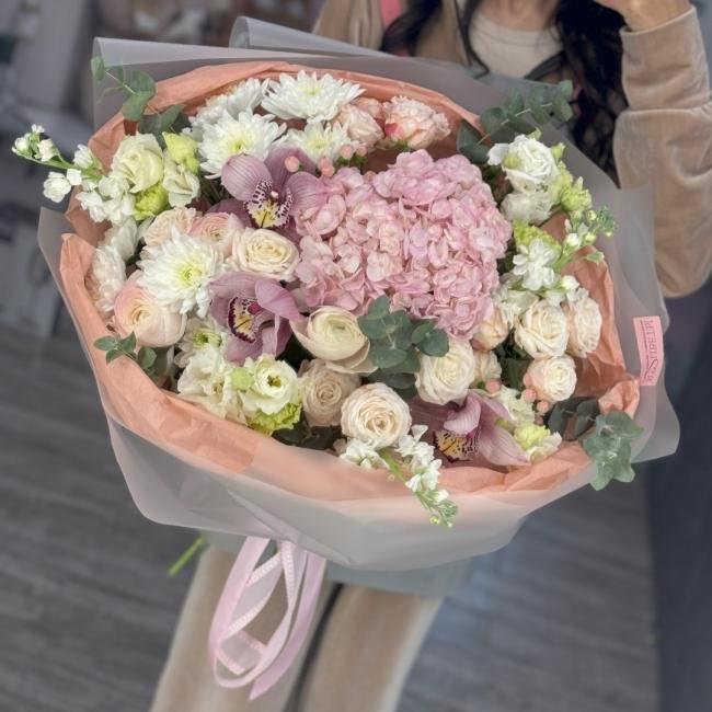 Описание В составе: гортензия, орхидея, ранункулюс, кустовая роза, кустовая хризантема, матиолла, эвкалипт.