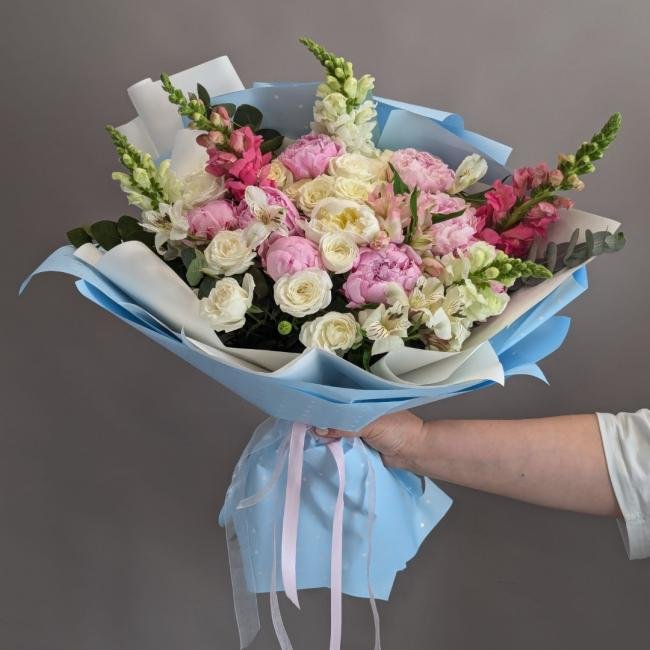Описание В составе: пионы, кустовая роза, альстрамерия, антирринум