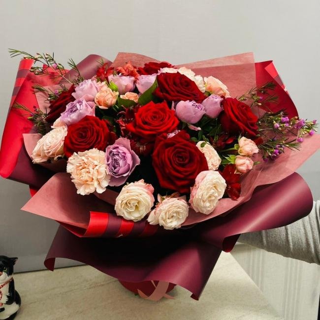 Описание Сборный букет "Афродита" наполнен страстью, любовью, цветением, жизнью! Где только не ступала богиня Афродита, там пышно разрастались цветы!