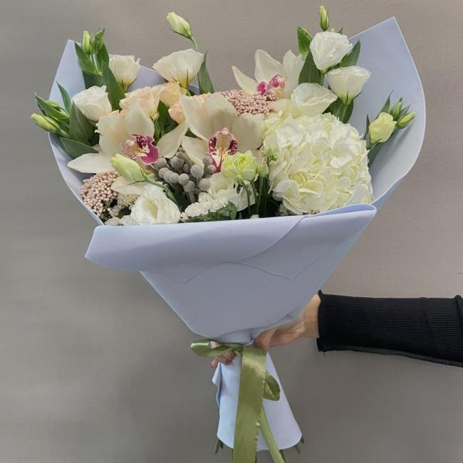 Описание В составе сборного букета: гортензия, орхидея, бруния, эустома, статицы, озотамнус.