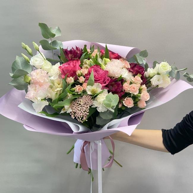 Описание В составе сборного букета: роза сорта кантри блюз, кустовая роза, эустома, альстрамерия, озотамнус, эвкалипт.