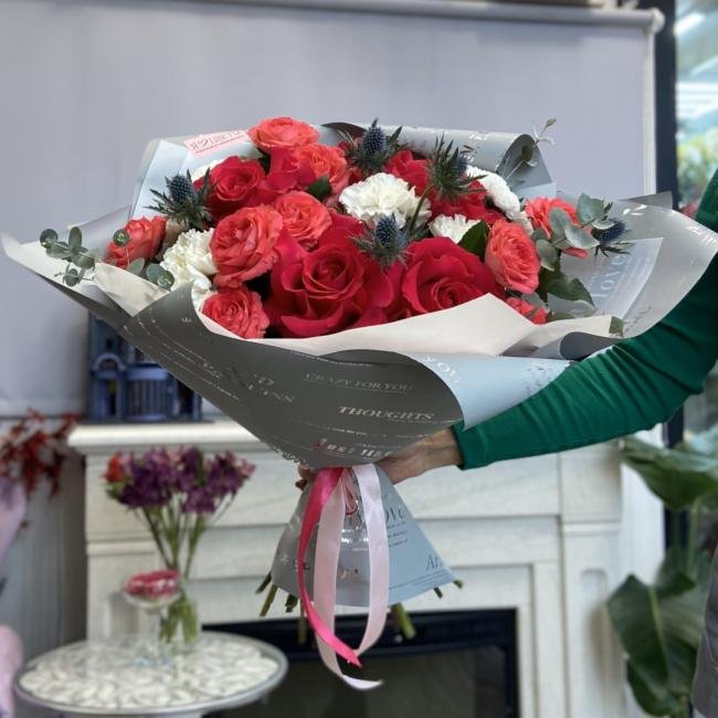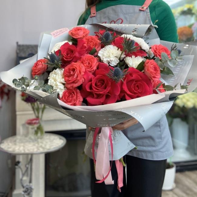 Описание В составе сборного букета: франзуская роза, кустовая роза, диантус, эвкалипт, эрингиум.