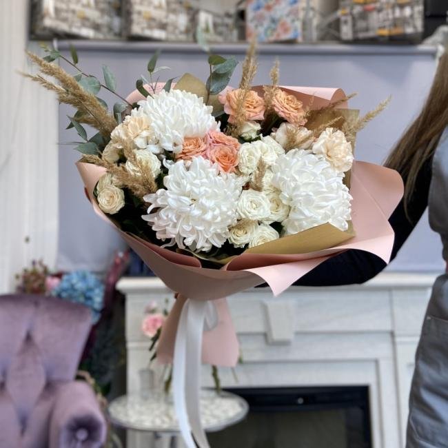 Описание В составе сборного букета: хризантема, кустовая роза, сухоцветы.
