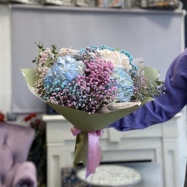 Описание В составе сборного букета: гортензия, гипсофила, эвкалипт.