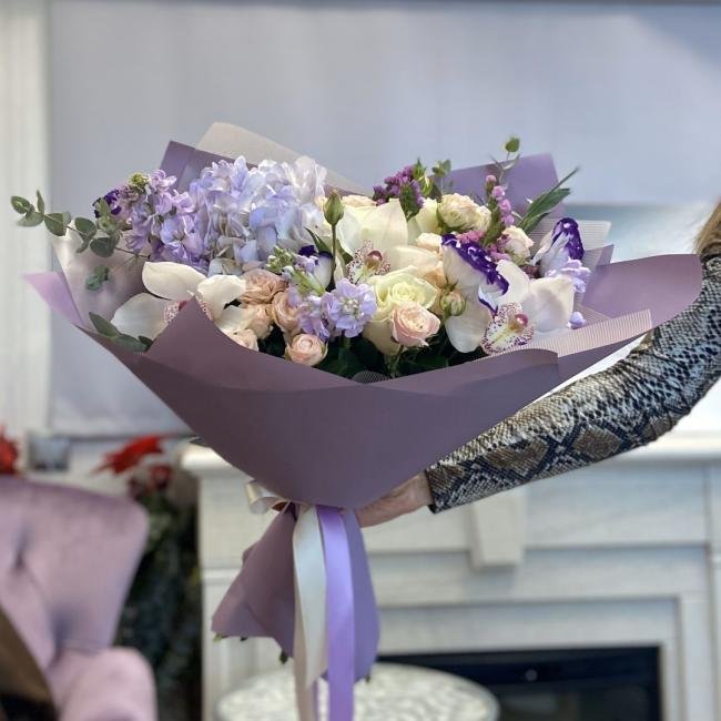 Описание В составе сборного букета: гортензия, кустовая роза, эустома, орхидея, статица, матиола, зелень
