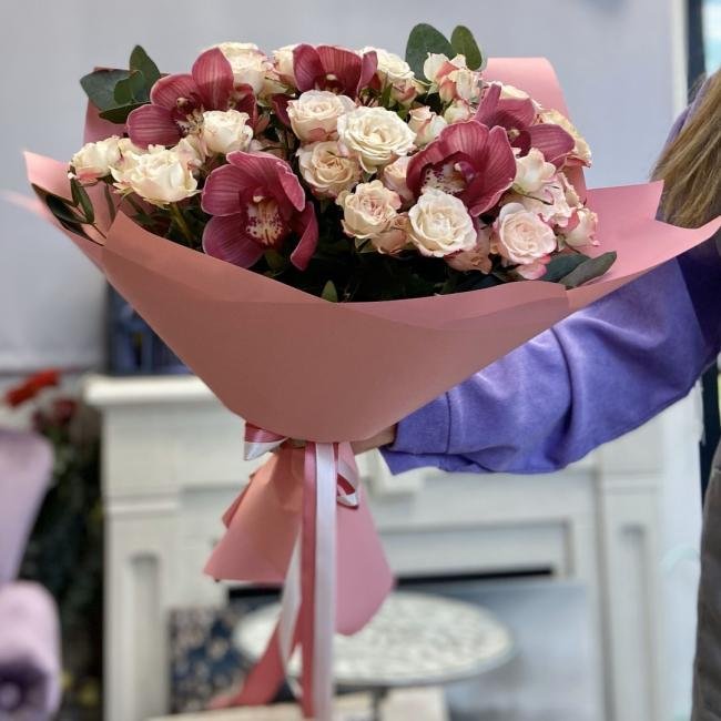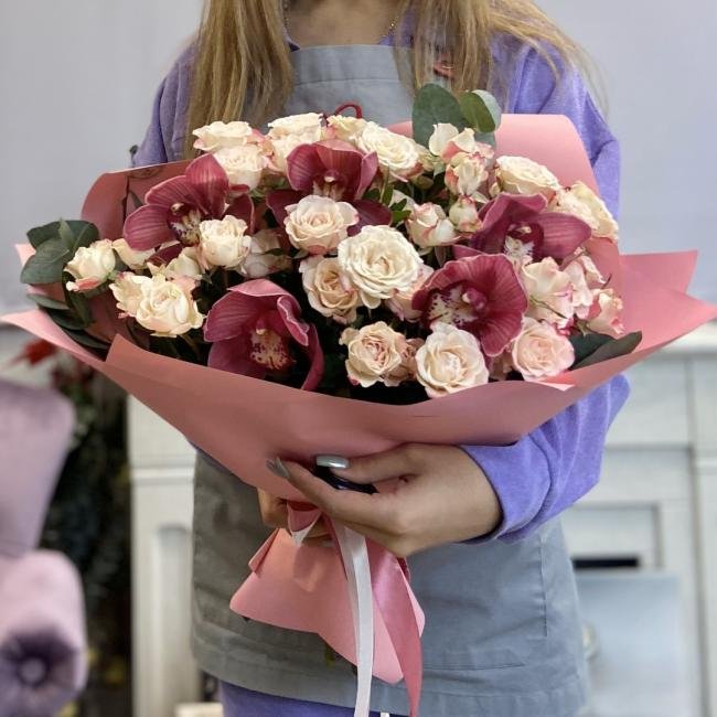 Описание В составе сборного букета: орхидея, кустовая роза, эвкалипт.