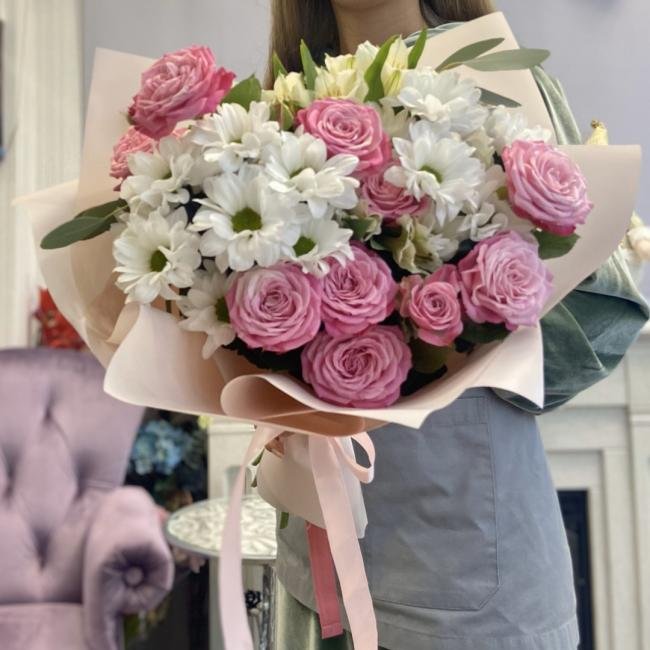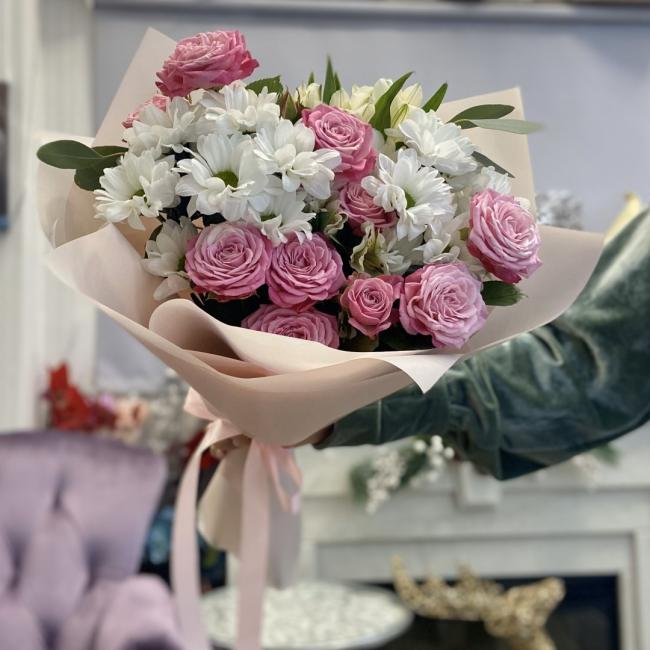 Описание В составе сборного букета: кустовая роза, кустовая хризантема, альстрамерия.