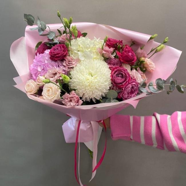 Описание В составе сборного букета: одноголовая хризантема, гортензия, пионовидная роза, кустовая роза, эустома, эвкалипт.