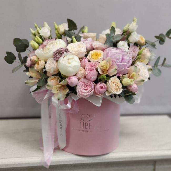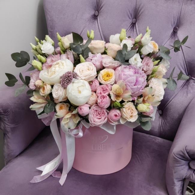 Композиция цветов #70 в шляпной коробке «Сьюзен»