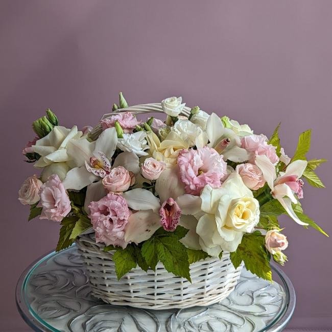 Описание В составе композиции: одноголовая и кустовая роза, орхидея, эустома.