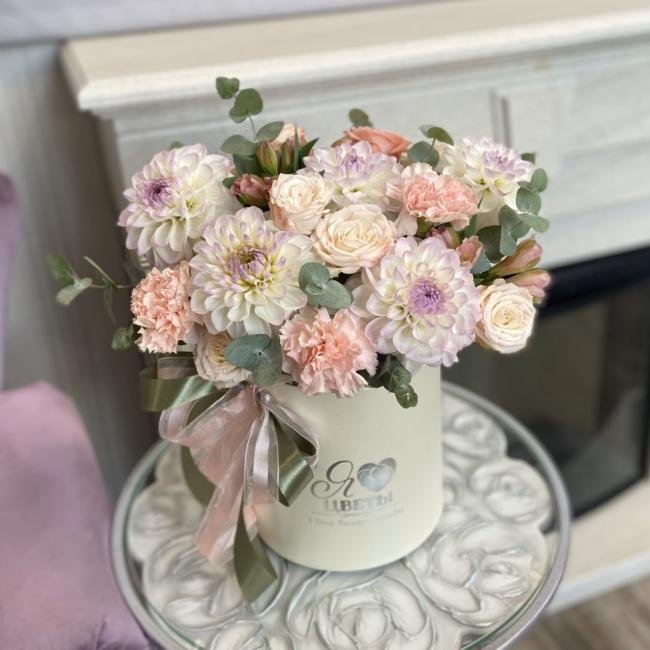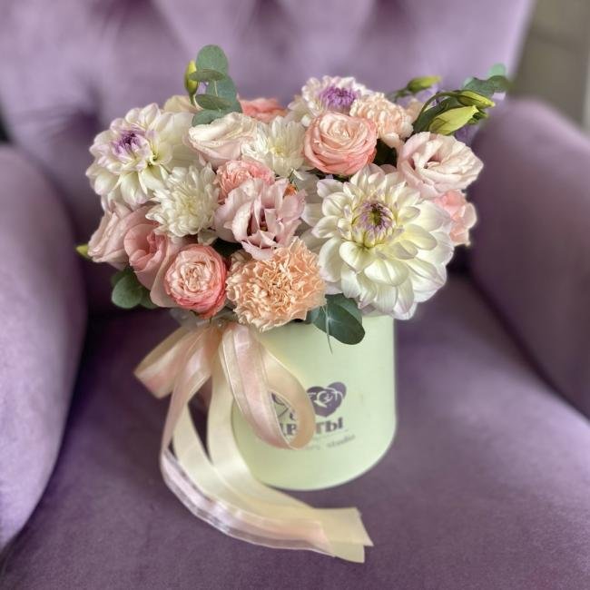 Композиция цветов #75 в шляпной коробке «Алессия»