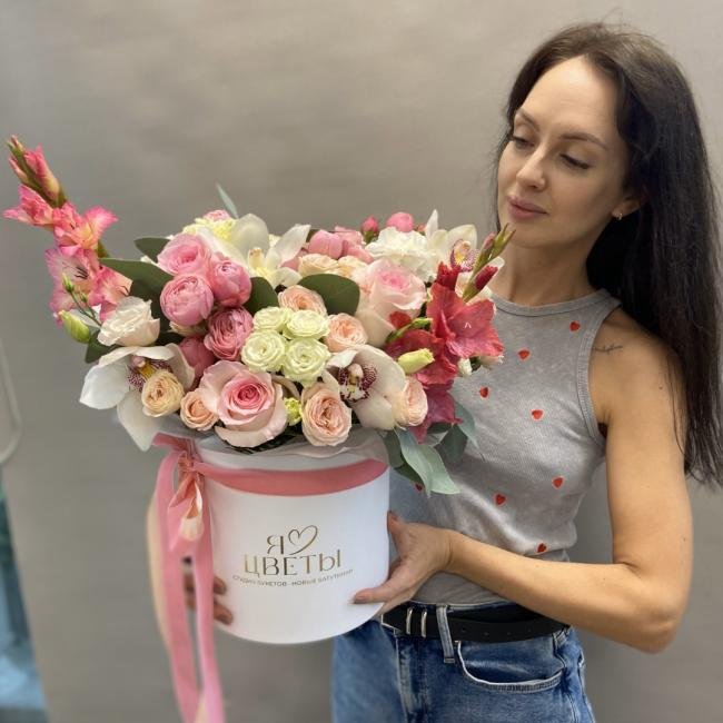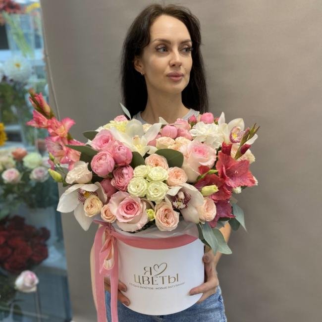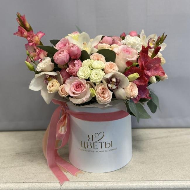 Композиция цветов #79 в шляпной коробке «Делфина»