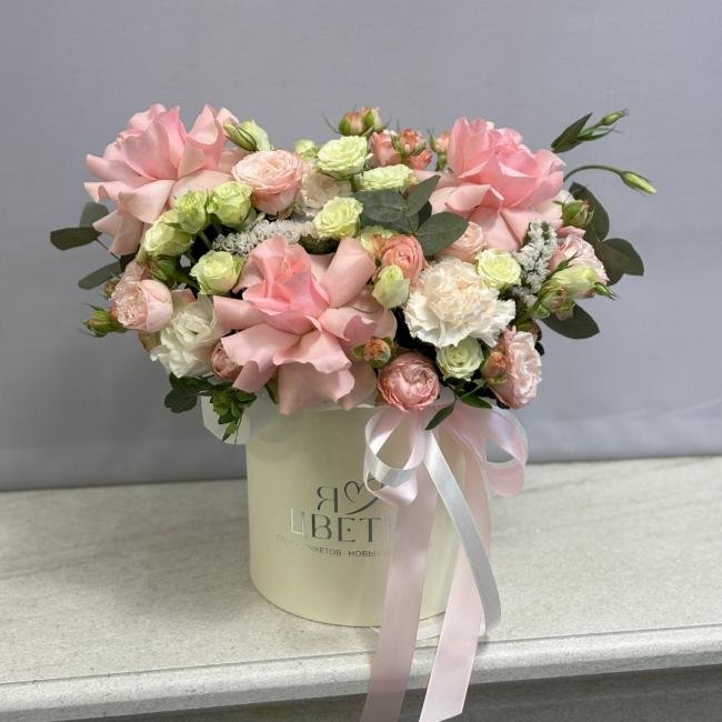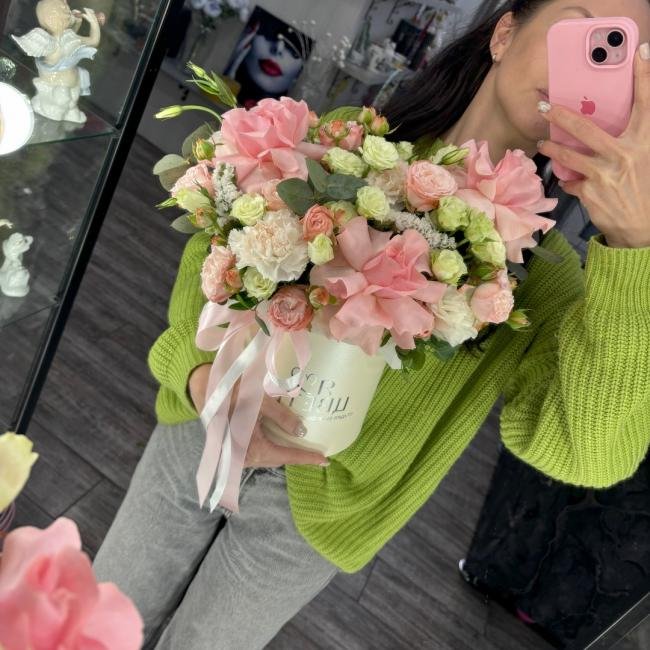 Композиция цветов #86 в шляпной коробке «Мичела»