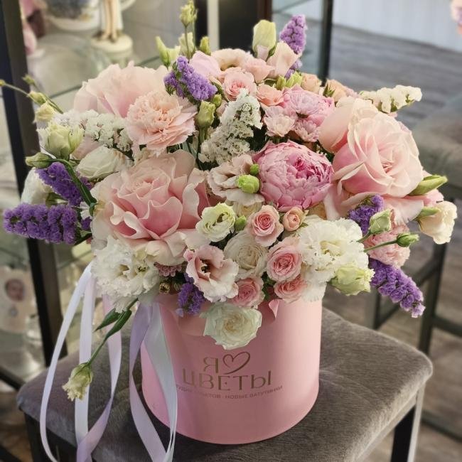 Композиция цветов #98 в шляпной коробке «Перрайн»