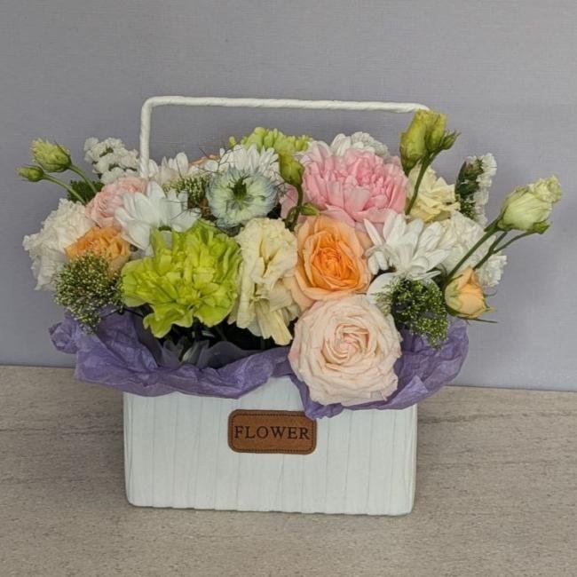 Описание В составе: кустовая хризантема, кустовая роза, диантус, эустома, зелень