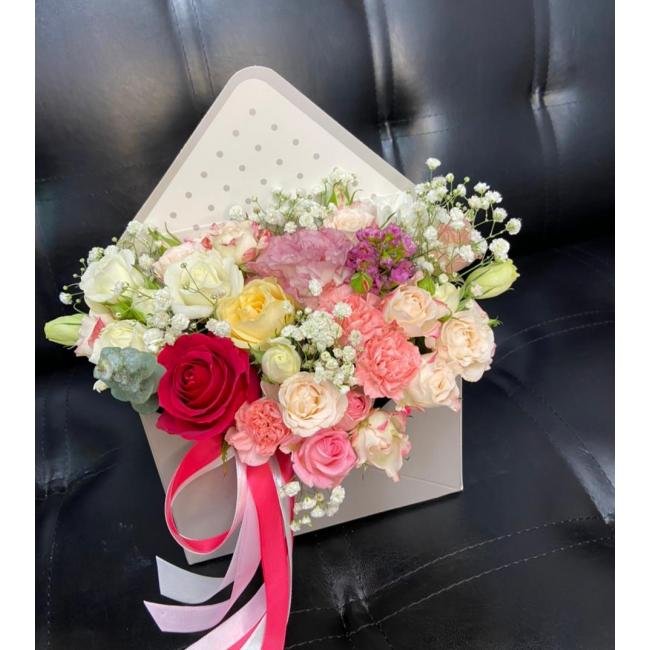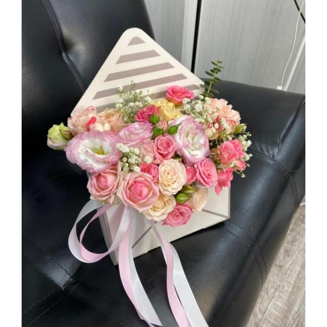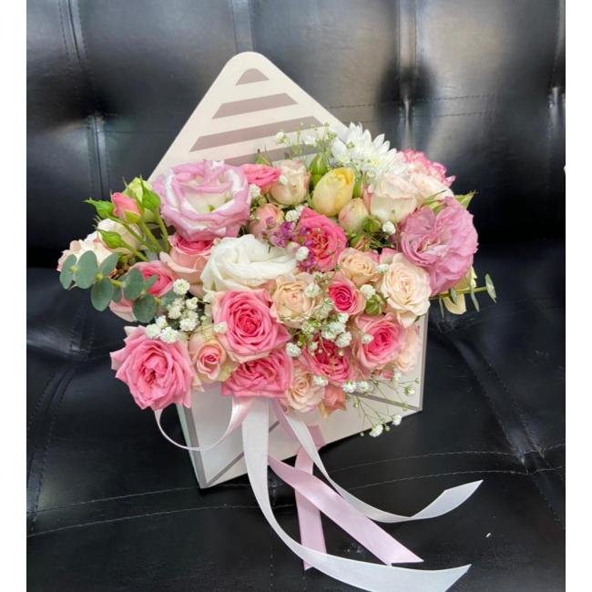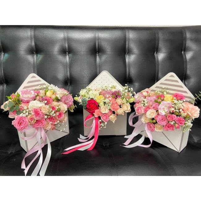 Описание Цветочная композиция в конверте , это как любовное послание любимой. Наши композиции могут быть очень разные,нежные, яркие, страстные.