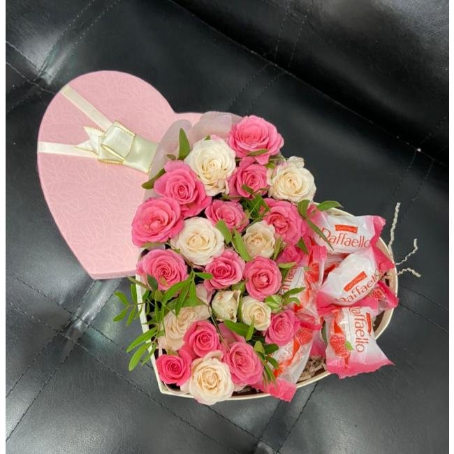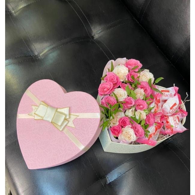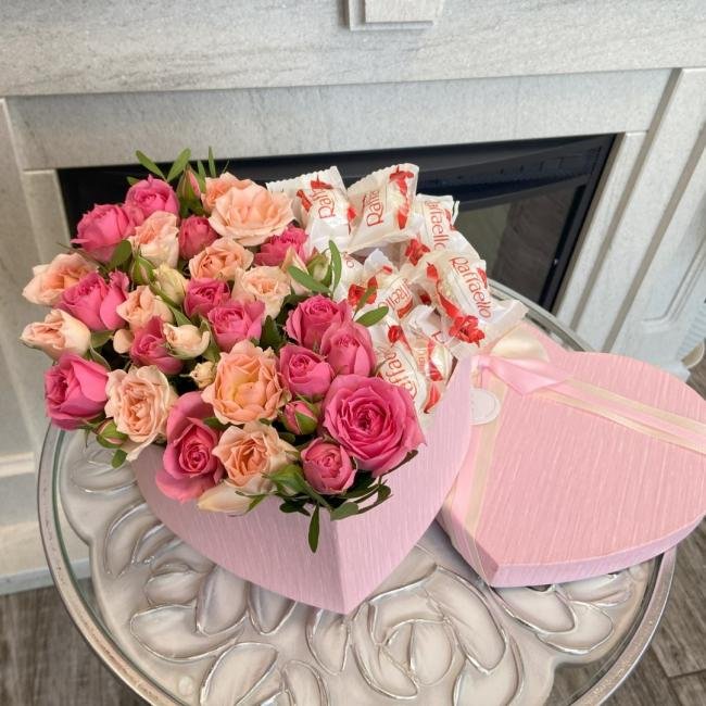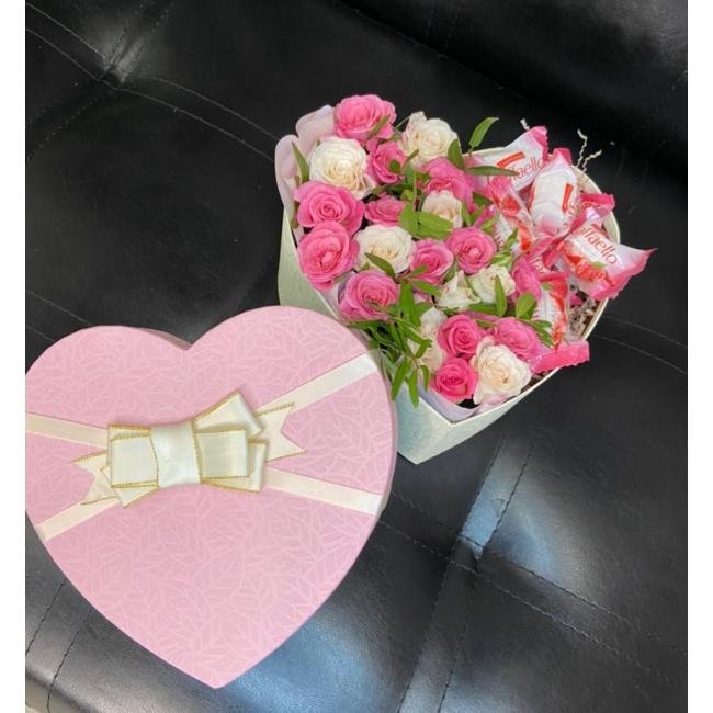 Композиция цветов #10 в коробке-сердце с конфетами «Авелин»