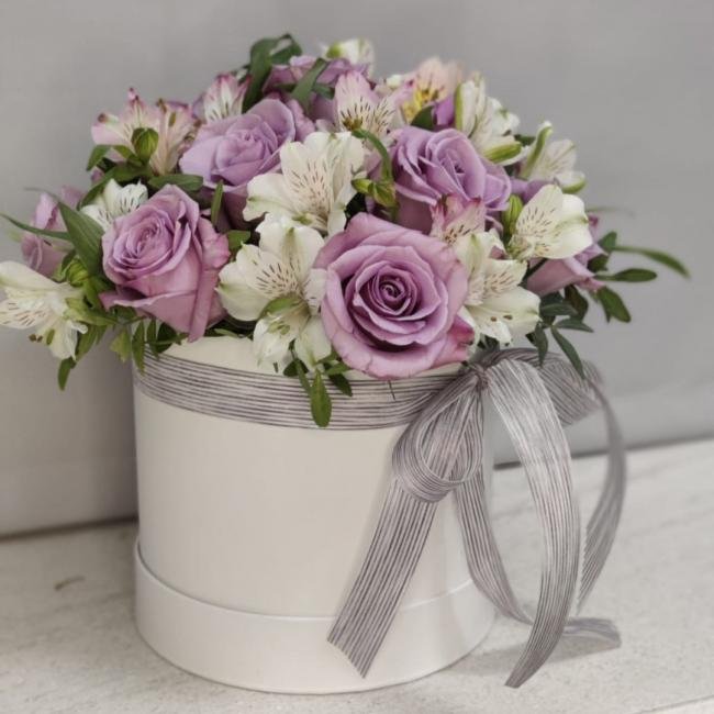 Описание Коробка цветов с сиреневыми розами расскажет своей обладательнице о чистой, бесконечной любви. А альстромерия подчеркнет нежность чувств. Второй вариант на языке цветов - сиреневые розы способны подчеркнуть изящество и благородное происхождение.