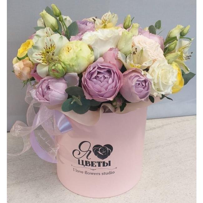Композиция цветов #19 в шляпной коробке «Клаудия»