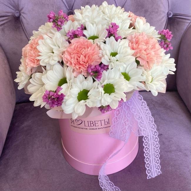 Композиция цветов #23 в шляпной коробке «Нежность»