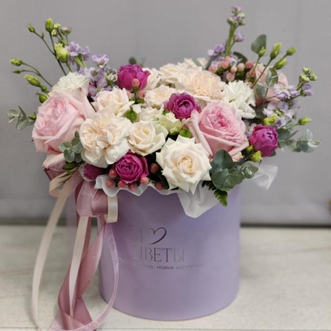 Композиция цветов #40 в шляпной коробке «Катрин»