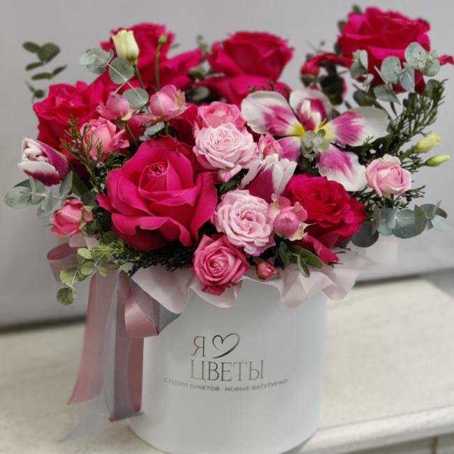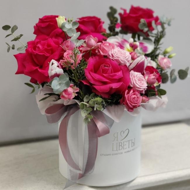 Композиция цветов #53 в шляпной коробке «Дебра»
