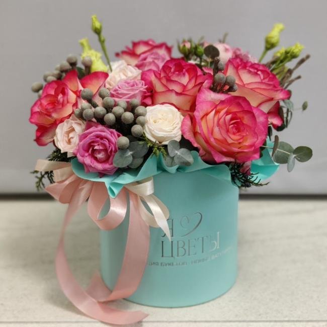 Композиция цветов #62 в шляпной коробке «Лагуна»