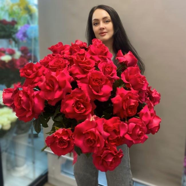 Описание Объемный и шикарный букет из 31 французской розы сорта Эквадор Готча.