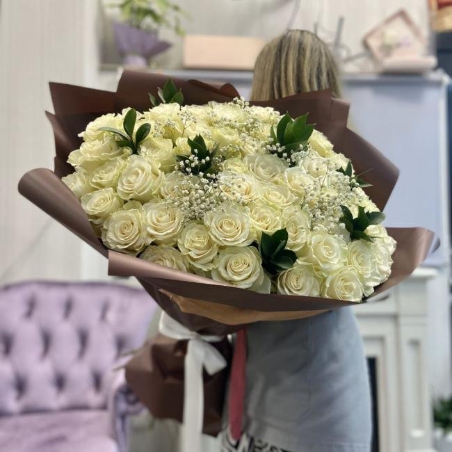Описание Моно букет из белых роз сорта Эквадор и гипсофилы.
