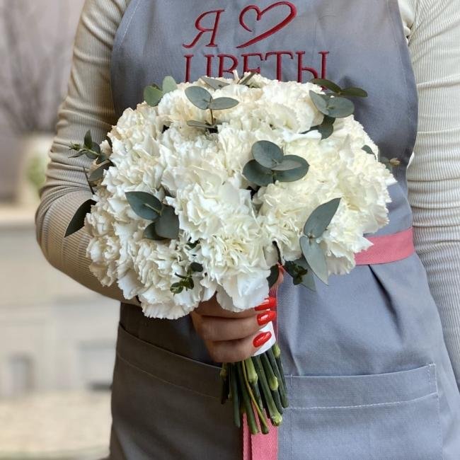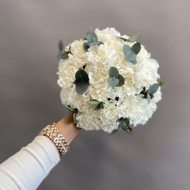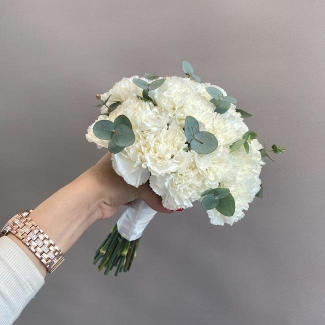 Описание Нежный букет невесты из диантусов и эвкалипта.