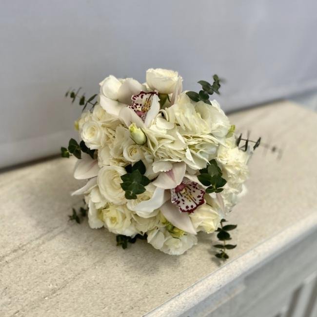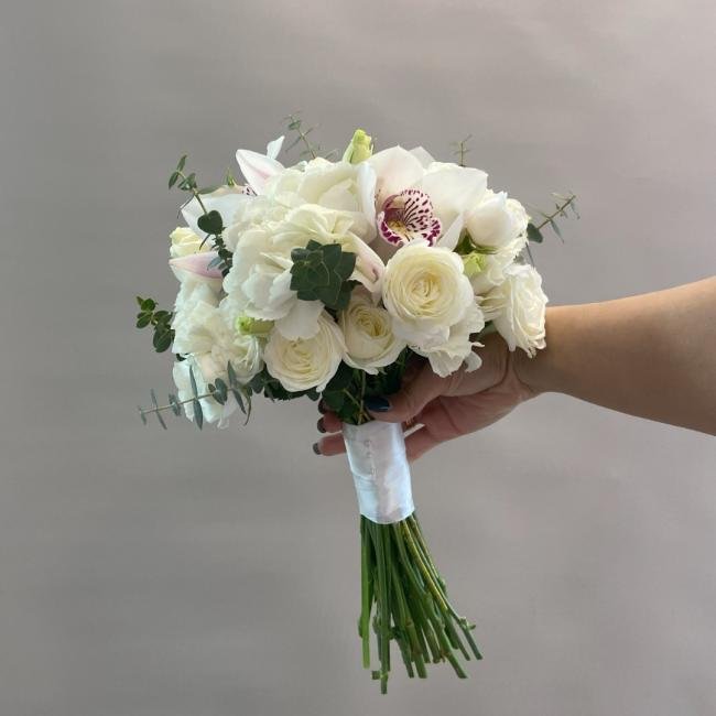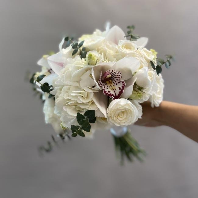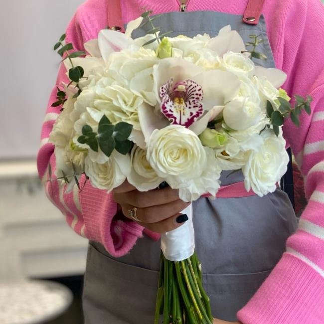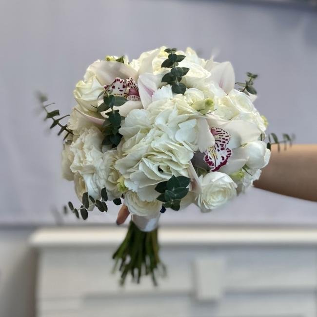 Описание Нежный букет невесты из гортензии, орхидеи и кустовой розы